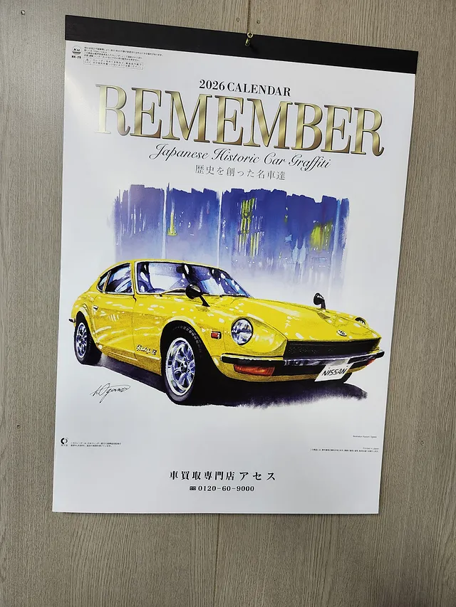 壁にかけられたカレンダーの一枚には、鮮やかなイエローの名車が描かれています。